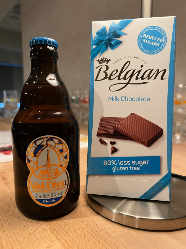 ミルクチョコレートには、あまり強くないビールを合わせたい。ヴァルデュー・ブロンドは軽い飲み口のブロンドエールで、アルコール度数は6.0%。コク、香り、旨味のバランスが非常に良く、爽やかな口あたりとなっている。筆者が実際にテイスティングを行った結果、ミルクチョコレートの甘いフレーバーをヴァルデュー・ブロンドが引き立ててくれる効果が感じられた。